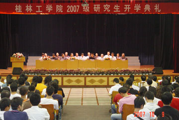 10月9日晚上,学院召开2007级研究生开学典礼。会议由学院党委副书记、博士生导师张学洪主持 ,学院党委副书记、院长、博士生导师赵艳林出席会议,学院博士生导师,学工部、研究生部、科技处主要负责人,有研究生的系(院)主任(院长)、分管研究生工作负责人,2007级研究生班主任,2007级全体研究生参加会议。 赵院长首先代表全校师生员工对2007级研究生新同学来到山水甲天下的美丽城市――桂林,来到桂林工学院这个温暖的大家庭继续深造表示最热烈的欢迎。他在介绍学校概况时说,学校研究生培养起步于上世纪80年代初,经过20多年的不懈努力,我校研究生规模不断扩大,学科门类不断增加,招生类型不断拓展,培养质量稳步提高,特别在全校上下立志于申请更名大学、申请博士学位授予权、建设高水平大学的今天,研究生教育已成为推动我校整体事业发展的重要动力和关键所在,同学们怀着满腔的抱负和对成才的渴望入校深造,可谓学正逢时。为此,赵院长向研究生新同学提出了三点希望,一要百折不挠地夯实学术根基,二要克服守成思想,增强创新能力;三要理论联系实际,积极投身于社会实践。 教师代表李景文、在读研究生代表陆桦、新生代表陈宏毅先后发言。李老师谈了自己对读研的认识和体会,并相信只要同学们树立远大的理想,以现在为起点,以行动为桥梁,从今天开始,珍惜每一分钟,抓住每一次机会,认真做好每一件事,就一定能成功。新生代表陈宏毅同学表示:作为桂工的研究生,我们不仅要完成自身的学业、科研任务,更要肩负起承接桂工学术传统,传递知识火炬的使命;我们不仅要学习、研究已有的知识和技能,更要发挥青年人的创新能力,创造出新的学说、理论和技术。
