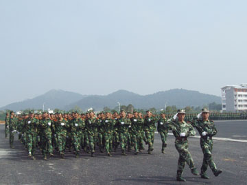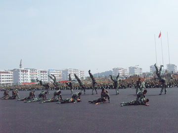 10月4日上午,我院2007级新生军训阅兵汇报表演在雁山新校区体育场隆重举行。 出席新生军训阅兵汇演的有学院党委书记黎志逘,党委副书记、院长赵艳林,党委副书记张学洪,党委副书记、纪委书记赵君,副院长阮百尧,副院长肖明贵,党委委员、人事处处长华桂林,桂林武警支队副队长、2007级新生军训团团长周玉景以及学院各职能部门和教学单位的有关领导。 阅兵汇演由学院武装部部长崔光仁主持。 早上9:30,离汇演还有半个小时,由26个连队3100多名新生和官兵组成的军训团早已在新校区体育场上列好阵势,远远望去是一片撼动人心的橄榄绿。 十点整,随着庄严的国歌响起,2007级新生军训阅兵汇演正式开始了。大会的第一项是阅兵、分列式。在桂林武警支队副队长、军训团团长周玉景的陪同下,学院党委书记黎志逘依次检阅了全场26个昂首挺立的新生军训连队,向教官和同学们致以亲切的问侯。随后,26个新生军训连队在教官的带领下,依次列着整齐的队伍,踏着矫健有力的步伐正步走过主席台,同学们一致向主席台上的领导行注目礼,高喊着“严格训练,严格要求,努力学习,报效祖国”,嘹亮的口号声带着桂工学子燃烧的激情响彻雁山上空。 紧接是军训汇报表演。首先出场的是由100多名女生组成的女子方块队。在教官洪亮的口令声中,她们齐声高唱军歌《一二三四》,表演了英姿飒爽的队列操。队列分错、交叉,那嘹亮清脆的歌声伴随着她们整齐而稳健的步伐,生动而传神地演绎出当代女兵的巾帼风貌! 女子方块队刚刚退场,男子擒敌连便刚健勇武地冲上来,俨然一群杀气腾腾的战场英雄。随着一声令下,一百多名高个男生迅速地摆出一个分散的矩形方阵,遵照教官的口令,高喊着口号,迅猛有力、豪气万丈地打出一套虎虎生威的擒敌拳。全场观众报以热烈的掌声。 最后的压轴大戏是军训教官们的精彩表演。多位训练有素的教官手把棍棒,表演了一套武警中常用的“应急棍术”,棒起棒落,时旋时伸,英气逼人。紧接着是二人对战,每一招式都扣人心弦。体育场上时时掌声雷动,不绝于耳。 在精彩的汇演过后,武装部部长崔光仁宣读了关于表彰2007级学生军训先进集体和先进个人的决定,并为各先进集体和先进个人代表颁发了奖状、证书。 桂林武警支队副队长、2007级新生军训团团长周玉景与学院党委副书记、院长赵艳林先后发表了讲话。在讲话中,两位领导都对教官与同学们多日来的艰苦训练所取得的成绩表示了充分的肯定,高度赞扬了他们不畏艰苦、刻苦训练、团结互助的革命乐观主义精神,并鼓励同学们将军训过程中培养出来的好思想、好作风发扬到今后的学习生活中,积极弘扬“艰苦创业、敬业奉献、团结互助、开拓进取”的桂工精神。 伴随着铿锵有力的《军歌》的响起,为期十天的新生军训圆满结束。