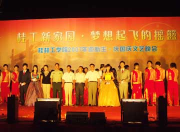 9月30日晚上,我院2007年“迎新生,庆国庆”文艺晚会在雁山校区大操场唱响。学院党委副书记、纪委书记赵君,党委委员、人事处处长华桂林,党委宣传部部长于海平,学工部部长熊英,团委书记辛立章等以及部分系(院)的领导,新生年级辅导员、班主任与2007级新生一起观看了精彩的演出。 晚会中,有优美抒情的独唱、激情彭湃的诗朗诵、青春奔放的舞蹈,还有充满阳刚之气的武术表演,让2007级新生享受了一次充满青春朝气的文化盛宴。在现场为2007级七位新生过生日,更把晚会推向了高潮,赵君副书记代表学院给过生日的同学送上真挚的祝福,引得全场掌声雷动,让2007级全体新生都感受了桂工大家庭的温暖。 新校区,新学子,充满着青春与活力,充满着对未来的美好憧憬,在这个喜庆的日子里,让我们共同祝愿我们的祖国更加繁荣、昌盛,我们的学校明天更加美好。