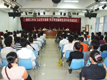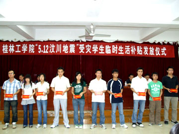 在这次汶川地震中,我院四川籍部分同学的家中也不同程度地遭受损失,对此学院领导和全院师生都深表关注。为了更好地帮助这些同学顺利度过难关,5月19日下午,学院为“5.12汶川地震”受灾学生发放了生活补助。学院“5.12汶川地震”受灾学生生活补助发放仪式在大学生活动中心举行。学院党委副书记张学洪,党办(院办)、党委组织部、招生就业处、工会、教务处、团委等职能部门有关负责人出席会议并在主席台就座。学院学生工作部(处)部(处)长熊英主持了仪式。 学院党委副书记张学洪在仪式上讲话,代表学院党委行政向家庭受灾同学及他们的家人、父老乡亲表示慰问。他说:“同学们,如果你们有什么困难,有什么需要,可以随时向学院反映,我们一定会想办法尽可能满足你们的需要,尽最大力量支持你们重建家园。”张学洪副书记告勉同学们,“面对此次汶川的特大地震灾害,请相信我们的党,相信我们的祖国,相信全国人民一定会和四川人民团结一致抗震救灾,希望大家化悲痛为力量,以实际行动抗击震灾,为我们国家的安定和富强,为灾区重建而奋发图强,努力学习!” 院学生会主席周智华同学代表全院同学发言,表示要以实际行动抗击震灾,为我们国家的安定和富强,为灾区重建而奋发图强,努力学习。汶川地震受灾学生代表、人文社科系杨冰权同学在发言中感谢党和政府对灾区人民的亲切关怀和对抗震救灾工作的坚强有力的领导,感谢英勇战斗在抗震救灾一线的人民解放军、武警官兵和来自各条战线的救灾志愿者与工作者,感谢全国亿万同胞捐款捐物帮助灾区人民度过难关重建家园,感谢学校领导和全院广大师生对受灾学生的关心和关爱。他说,“全院掀起了抗震救灾活动的高潮,对我们受灾学生更是关怀备至,使我在伤痛之余多了一份自信和温暖,桂林工学院就是我另一个温暖的家。我一定会响应学校的号召安心学习,相信在党和国家以及全社会的共同努力下一定会赢得抗震救灾的胜利。” 主席台就座领导为汶川地震受灾学生代表发放了生活补助。据悉,本次学院共为107名受灾学生发放补助98500元。