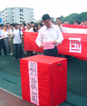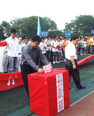 震灾无情,民心有爱。5月12日下午14时28分,四川省汶川地区遭受8.0级严重地震灾害,造成巨大的人员伤亡和财产损失。一方有难,八方支援。面对灾情,学院党委立即召开会议,布置了支援抗震救灾工作,5月14日下午5:00在学院运动场举行了向四川汶川地震灾区募捐仪式。仪式由学院副院长李祥清主持,学院党委书记黎志逘在募捐仪式上号召大家“拿出自己的热情,奉献自己的爱心,展示桂工人的良好品质,为国分忧,为灾区人民尽力,与灾区人民风雨同舟,踊跃向灾区群众捐款捐物,用我们的实际行动帮助灾区人民战胜困难,渡过难关,重建家园” 。 在校的党委书记黎志逘,党委副书记、纪委书记赵君,副院长李祥清、阮百尧、肖明贵,院长助理华桂林亲自带头捐款,学院院长赵艳林、党委副书记张学洪出差在外,也委托学院代为捐款,全院师生员工近万人积极主动来到捐款现场慷慨解囊,以捐款的方式表示了对四川抗震救灾的支援,也表明了与灾区人民共度难关的心意。截止到发稿之时,学院已募捐到救灾款20多万元。 参加捐赠的很多教职员工都说,灾区受灾情况太惨重,学院举办此次活动非常及时;资环系吴虹教授激动地说:“抗震救灾,匹夫有责。这是我们的兄弟姐妹们在受难,我们义不容辞地要帮助他们。我们要把灾难转化成全国人民团结一心、众志成城的精神和力量” ;一位不留姓名的老师个人捐款达1万元;电计系男子足球队的队员们把经过艰苦拼搏获得的学院足球比赛冠军奖金400元全部捐献出来,他们告诉记者,虽然这点捐款杯水车薪,但可以表达对灾民的一点心意,也为能为灾区出份力而感到高兴;艺术系学生徐丽丽表示,自己虽然捐款不多,可相信大家的合力一定能为帮助灾区渡过难关出一份力;还有的退休老教师特地从家里赶来捐款,他们说,从电视上看到地震的场景很是揪心,很想为灾区人民做点什么,听到学院组织捐款的消息就赶来了;刚放学的孩子也跟着家长为灾区捐款。这一切真可谓是“抗震救灾、众志成城、心系灾区、奉献爱心”。 学院领导表示,明天雁山校区的捐款结束后,将会以最快的速度把募捐款送达灾区,为抗震救灾工作发挥作用。