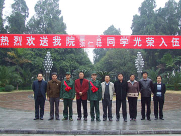 12月10日上午,我院土木系覃含、张仁祥两位同学身穿绿色军装,胸前佩着大红花,光荣应征入伍,踏上从军之旅。学院党委副书记张学洪,学院党委委员、院长助理、人事处处长华桂林,党(院)办、学工部(处)、武装部、土木系领导送他们到校门口上车,土木系同学和两位应征入伍同学的家长也早早地来到学院大门口为他们送行。 张学洪副书记与两位同学亲切握手,并叮嘱他们到部队后要尽快适应从大学生向普通士兵的角色转变,在军队的大熔炉里自觉接受考验,不断提高思想觉悟和综合素质,充分运用自己所学知识为部队现代化建设作出自己的贡献。其他送行的各职能部门领导和土木系领导,也叮咛他们到部队后要刻苦锻炼,认真学习,当一名好兵,为母校争光。 大学生参军入伍是时代赋予大学生的历史使命,对于提高军队现代化建设水平和大学生自身素质都具有十分重要的意义。多年来,学院对选拔在校大学生应征入伍工作高度重视。2003年以来,学院每年都在全校大学生中进行广泛的宣传,鼓励大学生们积极报名、踊跃参军。经过严格的体检和资格审核,截止今年,我院已经为部队输送了19名大学生,他们中有的服役期满回校继续完成学业,有的考上了军校或警校,还有的当上了士官留在了部队。