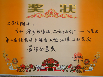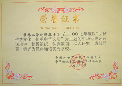 12月4日至6日,中国教育学会重点课题“诵读经典诗文,提高学生的人文素养及语文素养”、教育部重点课题“中华传统文化经典诵读及其课程化研究”第四届课题研究观摩研讨活动在广西首府南宁举行。中国关心下一代工作委员会中华传统文化诵读工程蔡恒奇秘书长给2007年度全国经典诵读优秀学校、优秀课题组颁发证书和授牌。我院附小因积极组织,认真策划,深入研究,成效显著,获得“全国经典诵读优秀学校”荣誉称号。我院附小课题组撰写的中期课题研究实验报告被评为“全国优秀实验报告”,朱雪豫、谢培老师被评为“中华经典诵读全国优秀指导员”,陈立新老师被评为总课题组“经典诵读优秀教师”,赵阳天、李彦哲、刘依润同学被评为“全国百佳国学少年”。 另悉,在12月10日举行的“漫步唐诗路,品味千古韵”——七星区第二届经典诗文诵读大型汇演活动中, 我院附小参赛节目“凝神水声舟影间”以独具创意的构思、精彩的表演获得一等奖,同时荣获参赛的21所学校中唯一的“最佳创意奖”。