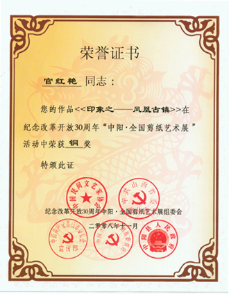 日前,在由中国民间文艺家协会、中共山西省委宣传部等单位主办的“中阳·全国剪纸艺术展”活动中,我院艺术系学生、剪纸协会会员官红艳的作品《印象之——凤凰古镇》,描绘了凤凰古镇的居民建筑,体现了浓厚的风土人情,并以其独特的剪纸风格赢得了组委会的好评,一举从参赛的900多幅作品中脱颖而出荣获铜奖,成为广西唯一获奖的选手,也是此次所有获奖选手中年龄最小的选手。其作品被收入《古韵新彩——纪念改革开放30周年全国剪纸艺术展获奖作品集》。11月22日,官红艳同学参加了在北京人民大会堂重庆厅举行的颁奖仪式,主办单位电视台对其进行了采访。 “中阳·全国剪纸艺术展”为中国民间艺术界纪念改革开放30周年活动之一,在此次艺术展中,共评出金奖10名,银奖20名,铜奖30名,优秀奖100名。全国人大副委员长周铁农、司马义.艾买提,中国领导科学研究会会长、中央党校原常务副校长刘海藩,中央网络领导小组组长张虎生、中共中央宣传部文艺局副局长汤恒、教育部常务副部长袁贵仁、全国记协党组书记翟惠生、人民日报社副总编辑米博华、新华社副总编辑夏林、中央电视台副总编辑张华山、光明日报社副总编辑陆彩荣、中国文联书记处书记白庚胜等领导出席了颁奖仪式。国内50多家主流媒体记者到会。颁奖仪式上,同时举行了《古韵新彩——“中阳·全国剪纸艺术展”优秀作品集》首发式和中国民间文艺家协会授予中阳县“中国剪纸传承保护基地”的授牌仪式。 11月24日至11月27日,在北京大学、中国人民大学举行了以“民间艺术进校园”为活动主题的“纪念改革开放三十周年‘中阳·全国剪纸艺术展’”巡回展出。