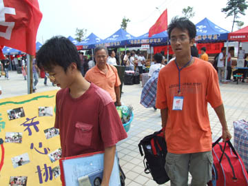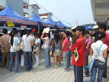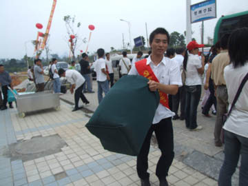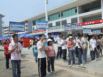 9月23日是我院2007级新生正式报到注册的第一天。8点多钟的时候,设在雁山校区学生食堂前的整个迎新接待站就已经是摩肩接踵、人声鼎沸,热闹了起来。然而热闹之中的迎新工作却是一派井然有序、和乐融融。学院党委书记黎志逘,学院院长赵艳林,学院党委副书记、纪委书记赵君,学院副院长李祥清、肖明贵早早地来到迎新现场视察指导迎新工作。新华社桂林支社、中国改革报驻桂林记者站、桂林日报、桂林电视台等各大媒体记者今天也赶到了雁山校区迎新现场进行采访,并参观雁山校区。 当各系院的迎新工作学生志愿者们高高举着系、院牌等候在那里接站并主动帮新生及其家长拿包抗行李,并带他们或去系院接待站报到、或带到休息处休息的时候,当披着印有金黄色的“学生党员为您服务”字样红绶带的学生党员忙着从汽车行李箱帮助新生取行李的时候,当接待站的老师和同学们热情地请新生和他们的家长坐下,并递上一杯清水问候“一路辛苦”的时候,当报到注册处、收费处、军训物品发放处、学生食堂售饭口的师生员工们面带微笑,耐心地解答新生和家长们的每一个问题、认真做好每一项工作的时候,当志愿者服务队的同学们耐心地为学弟、学妹们讲解学校、系院和专业情况,为新生家长的咨询住宿、返程耐心地解疑答难的时候,当老师和志愿者们帮助新生拿着大包小包到宿舍入住时,旅途劳顿、困乏疲惫的新生和家长们的脸上无不流露出了满意的笑容。 在学院提出了尽量做到让学生满意,家长满意,社会认同的迎新工作目标后,学院各级领导身体力行,带领老师们做好迎新工作。学院领导,各系、院党政主要负责人和各有关职能部门负责人都在迎新一线指挥工作。22日晚上,赵君副书记、肖明贵副院长带着指挥部的同志们,在学生入住后一个一个宿舍看望学生。李副院长从学生食堂的一楼到三楼,从吃饭的学生到做饭的炊事员认真调查了解饮食情况。在迎新工作中,有很多老师亲自帮学生拎着行李送到宿舍去,还有300多名学生迎新志愿者在迎新一线尽情地挥洒着汗水。在师生们热情的服务的感染和带动下,有的刚刚报到的新生也志愿加入到了迎新服务志愿者的行列。 学校还为贫困生开辟了“绿色通道”,可以先报到,然后办理银行贷款或缓交学费手续。而且,雁山校区的食堂也不对外承包,不以赢利为目的,坚持以服务学生为宗旨,在雁山镇肉价、菜价高于市内的情况下,坚持做到“服务不减,标准不降,价格不涨”,与屏风校区饭菜价格完全相同。 在迎新现场,记者见到了保卫处处长崔光仁同志,由于差不多整整两天他都顶着烈日指挥工作,他的脸已经被太阳晒得黝黑。据崔处长介绍,学院保卫处8名同志和学院雁山校区37名保安人员昼夜值班,雁山镇派出所和雁山交警大队各派出4名同志,协助做好雁山校区新生入学的安全保卫工作。从昨天上午8点到今天下午4点半,学院保卫处的领导和雁山校区的安全保卫人员的28名年轻人没有休息过一个小时,他们每隔一个小时就要对每一栋楼房进行一次检查。截至目前,迎新工作秩序井然,没有出现一起争执事件,从迎新工作开始到采访时,已经有2800多车次进入雁山校园,也没有出现一次交通事故或者交通堵塞的情况。 据统计,截至23日晚7点钟,已经有2500多名本科新生顺利报到入学。