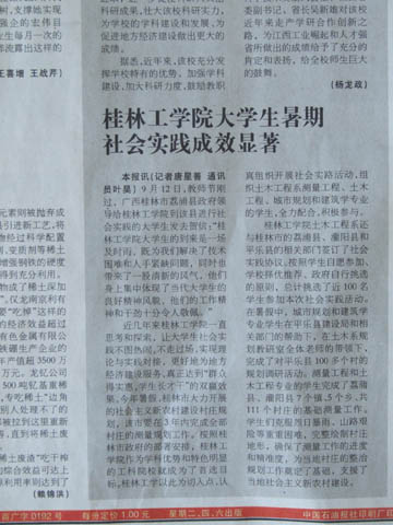 《中国有色金属报》在2007年9月15日第8版,《广西日报》在2007年9月21日第7版,相继对我院2007年大学生暑期社会实践活动情况进行了报道。