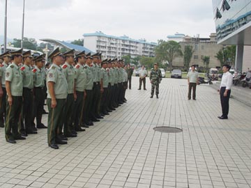 2006年9月14日下午,桂林工学院2006级军训承训部队武警桂林市支队官兵进驻我院。 5点,军训团各连连长和指导员在体育馆门口参加见面会。学院军训领导小组组长李祥清副院长对官兵的到来表示欢迎。军训团团长吴登培中校在见面会上作了简要讲话。各连连长、副连长和指导员进行了亲切交谈,分别就各连训练场地和学员等问题交换了意见。