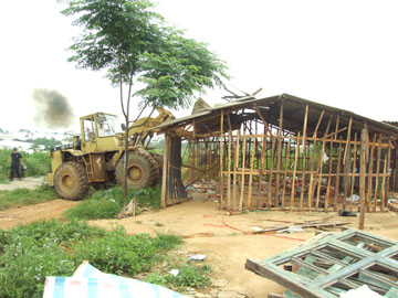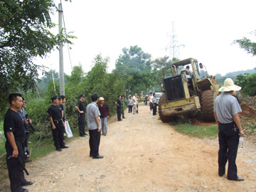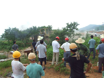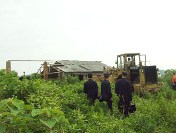 目前,尽快建起新校区的主干道、围墙和运动场已经成为新校区建设迫在眉睫的重要工作,然而,一些建筑诸如鸡棚、柴房等等却依旧零零星星地滞留在新校区用地上。在我院雁山校区一期工程征地完成后,雁山校区指挥部就通知这些建筑物的户主尽快予以拆除,几个月过去了,雁山校区指挥部多次催促,但仍有五、六处建筑没有拆除掉而成为违章建筑。 6月26日,我院雁山校区指挥部与桂林市公安局雁山分局、雁山区政府、雁山区指挥部、雁山区政法委、雁山区市容局、雁山镇政府联合行动,共出动人员100多人,一举拆掉了这些违章建筑,同时也清除了影响施工建设的树木。我院党委副书记赵君亲临现场,雁山校区指挥部、市公安局雁山分局、雁山区指挥部、雁山区政法委、雁山区市容局、雁山镇政府的全体领导也都到场指挥行动。 另讯:为使雁山校区各项工程建设的扎实、有序、快速进行,雁山校区指挥部将各项工程项目分工负责、施工进度计划及进展情况张挂上墙,做到了分工明确、责任到人,任务明确,胸中有数。