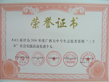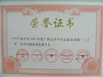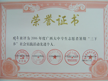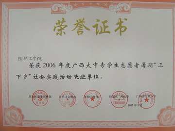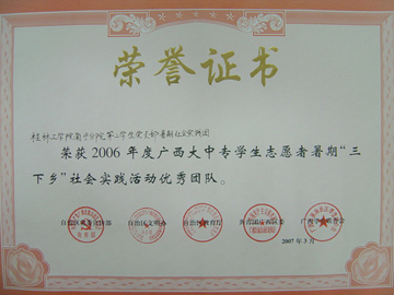近日,由自治区党委宣传部、自治区文明办、自治区教育厅、共青团广西区委及广西区学生联合会等6家单位共同评选的2006年度全区大学生暑期“三下乡”社会实践先进集体和个人揭晓。我院荣获“2006年广西大学生志愿者暑期‘三下乡’社会实践先进单位”称号。