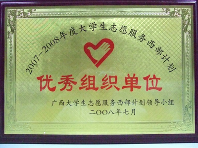 我院获得2007-2008年度广西大学生志愿服务西部计划“优秀组织单位”荣誉称号