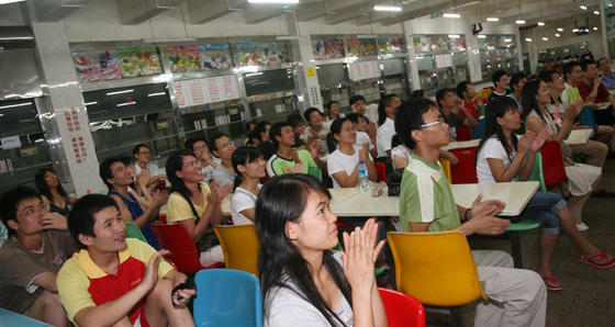 8月8日晚,2008北京奥运会于国家体育场盛大开幕。百年奥运,中华圆梦。这是亿万中华儿女热情企盼的百年梦想,也是桂工全体师生期待已久的民族盛事。为了满足暑期留校同学的观看需求,为同学们搭建起表达爱国情怀、祝福奥运开幕的平台,学院党委行政高度重视,精心组织了暑期留校学生集体观看奥运会开幕式现场直播。学院党委书记黎志逘亲自部署,副书记张学洪、副院长李祥清,以及各系院党总支副书记和1000多名暑期留校学生齐聚学院食堂,兴高采烈地观看了2008北京奥运会开幕式现场直播,为北京奥运会加油助威。 此外,为激励广大学生的爱国热情,满足暑期留校学生观看北京奥运会各项赛事电视直播节目的愿望,在北京奥运会期间,学院有关部门还将精心安排观看场所,全力做好后勤服务和安保等各项工作,确保同学们在良好的环境氛围中文明有序地观看到奥运赛事。