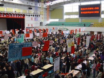 11月25日上午,我院体育馆三楼人头攒动,学院2007届毕业生第一次双选洽谈会在此举行。来自全国各地的100多家用人单位参加了洽谈会,提供了700多个工作岗位(很多用人单位在专业和人数上未作限制),其中有色地矿类、资源勘查类、化工类、旅游管理类所占比例较大。经过严格面试,目前用人单位已同100余名毕业生签订了用人协议。 此次洽谈会,学院领导十分重视,学院党委副书记张学洪亲临现场了解情况。另悉,我院2007届毕业生总计4719人,分布在硕士研究生、本科、专科三个层次。