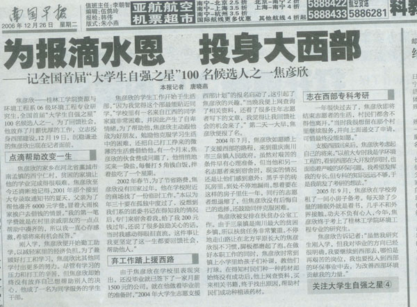 2006年12月26日,南国早报科教文卫版报道了我院资源与环境工程系2006级研究生焦彦欣同学,该同学经过层层筛选,入围了全国首届“大学生自强之星”100名候选人,他也是广西4名入选全国100名“大学生自强之星”候选人之一。截至发稿时止,他的投票数暂列全国第42位,广西第一位。希望全院同学继续支持焦彦欣同学,为他投上支持的一票。