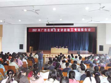 按照自治区党委关于把乡镇和企业作为培养锻炼领导干部的深厚源头和重要基地的战略部署,本着立足当前,着眼长远,从全面加强党的执政能力建设和先进性建设,建设富裕文明和谐新广西的高度,加大培养选拔优秀年轻干部的工作力度,为各级领导班子和干部队伍建设提供充足人才来源的目的,2007年,广西继续选调优秀大学毕业生到基层培养锻炼工作。为了吸引优秀大学毕业生到基层培养锻炼,做好这次选调工作,中共广西壮族自治区委员会组织部组成了选调生宣讲团,在全区各高校巡回宣讲。 12月21日上午,选调生宣讲团桂工专场报告会在南校区礼堂举行。报告会由学院团委书记辛立章主持。宣讲团成员有:孙国梁(共青团崇左市委副书记,中国人民大学马克思主义理论与思想教育专业2006届博士毕业生)、黄杰鹏(南宁市质量技术监督局干部,清华大学热能工程系动力机械与工程专业2006届硕士毕业生)、蓝飞(南宁市隆安县丁当镇党委书记,广西大学化工学院化学专业2001届本科毕业生)、段丽萍(柳江县人民法院拉堡法庭干部,西南政法大学法学院2006届本科毕业生)。他们分别结合自己做选调生的经历,从选择做选调生的心路历程、理由,做选调生工作的经历、成绩,做选调生的感受、体会等方面,向我院大学生进行了宣讲。报告结束后,宣讲团成员还现场回答了学生的有关问题。
