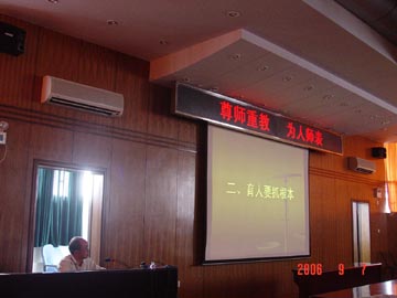 按照学院庆祝第22个教师节的工作部署,9月7日下午,学院党委宣传部、人事处、团委和关心下一代工作委员会联合组织了“师德师风教育”讲座。讲座在教九楼9501教室举行,由学院原副院长张秋光教授主讲,学院今年新进教师和部分学生干部参加了讲座。 张教授引经据典地从育人和教学等方面进行宣讲,他提出,教师要重视言传身教;要把对学生的理想、信念、人生观和世界观的教育落到实处;强调教师要“既做经师,更做人师”;在教学中要注重培植学生独立思考精神。张教授的精彩报告对促进我院师德师风建设将会起到积极的推动作用。 张秋光教授曾先后被授予冶金部、有色金属工业总公司劳动模范、广西壮族自治区先进工作者、桂林市优秀共产党员等荣誉称号。从1991年退休至今,十五年一直致力于关心下一代的“回报”行动,被授予“全国教育系统关心下一代先进工作者”、“全区教育系统关心下一代先进工作者”荣誉称号。