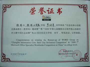 5月4日,2008年第七届国际办公软件核心技能世界大赛MOS(Microsoft Office Specialist)中国区总决赛在成都四川大学圆满落下帷幕,当日举行了隆重的颁奖典礼,成都市人大常委会副主任童若春、副市长傅勇林、市政协副主席杨兴平,微软培训全球授权机构美国思递波全球副董事长兼大中华区总管理处主席Randy Pierson,美国思递波亚太地区总经理Moses,美国思递波亚太地区全球渠道发展经理Scott,美国加州大学博士后、台湾师范大学博士生导师、微软办公软件全球认证中心全球资深顾问戴建耘教授和思递波大中华区总管理处副总经理颜家宇先生等出席颁奖仪式。 我院在此次大赛中表现突出,取得了Excel项目大学组冠军院校、PPT项目冠军院校2个集体奖项和5个个人奖项。为了提高我院家庭经济困难学生的就业竞争力,我院勤工助学公司一直与桂林市微软认证中心联合开展微软核心办公软件培训,并从PHE项目中拿出资金资助部分家庭经济困难学生参与培训,我院博文管理学院和管理学院的陆珍华、陈华钊、罗海军三名同学就是因在培训中成绩优异而被桂林市微软认证中心选送参加本项竞赛的中国区总决赛,并在比赛中分别获得“Word项目大学组冠军”、“PPT项目冠军”、“Word项目大学组亚军”。 此次大赛共吸引了包括清华、北大、上海交大等名校在内的全国30余个城市300余所院校的450名学生和老师参加。我院选手在此次大赛中获得多个奖项,成绩喜人。其中陆珍华同学将与其他三名冠军选手一同代表中国参加7月份在美国夏威夷举办的全球世界大赛,参赛费用全部由美国微软公司承担,预计将有60多个国家选手角逐奖牌,我们期待着陆珍华同学在即将到来的世界大赛中再创佳绩。