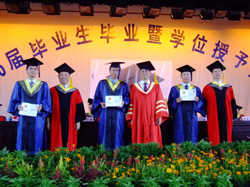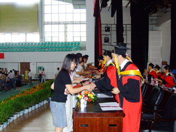 6月26日上午,学院2006届毕业生毕业暨学位授予典礼在体育馆三楼隆重举行。学院学位委员会成员、学生工作干部以及院本部全体毕业生2000余人参加了典礼。在主席台就座的院学位委员会成员有:学院党委书记阳国亮,院长赵艳林,党委副书记唐善茂、张学洪,副院长周德俭、阮百尧、肖明贵,研究生处处长刘康怀,科技产业处处长邹正光,资环系主任解庆林,土木系主任陈学军,电计系主任牛秦州,管理学院院长周永生,旅游学院院长程道品,艺术系主任常新航,人文社科系党总支书记梁军,成人教育学院院长吴郭泉,应用技术学院院长陈先华。 大会由张学洪副书记主持,阳国亮书记发表了热情洋溢的讲话。他首先代表学院党委和行政向我院2006届3000多名毕业生表示衷心的祝贺,同时向为他们的成长付出辛勤汗水的教职工表示崇高的敬意。在回顾了毕业生们在校学习期间所取得的成绩以及为母校建设和发展所做出的积极贡献后,他向毕业生们提出了三点要求:一要扎根基层,勤奋工作,报效祖国,服务社会;二要团结协作,诚实守信,抓住机遇,奋发进取;三要勤奋学习,知行合一,大胆实践,开拓创新。他说,走过50年风雨历程的桂工正在为创建高水平的教学型大学而努力奋斗,学院 “两申”目标的实现固然要靠在校师生员工的艰苦奋斗,同时也离不开社会各界特别是校友们的关心、支持和帮助,希望毕业生们以后要一如既往地关注母校的发展,多为母校出谋划策,多为母校与社会的联系牵线搭桥,在前进的道路上,相互支持、共同发展。最后,阳书记代表学院全体师生员工衷心祝愿毕业生们在新的征途上,事业有成、宏图大展、前程似锦! 阳书记讲话后,教师代表程小辉、在校生代表王卡、毕业生代表谷丽敏先后发言。 在唐善茂副书记宣读自治区和学院关于表彰2006年度优秀大学毕业生的决定,周德俭副院长宣读我院广西自治区选调生、志愿服务西部计划和西藏就业毕业生名单后,学院领导为他们颁了奖。 大会的最后一项议程:学位授予仪式,在阮百尧副院长宣读2006届毕业生毕业资格和学位资格审查报告后举行。我院2006届已完成全部学业获得毕业资格的毕业生有3183人,其中硕士研究生92名,本科生1923名,高职高专生1168名。他们当中有92人获得硕士学位,1877人获得学士学位;有8名被上海同济大学等录取为博士研究生,有146名被武汉大、同济大学、浙江大学等院校或研究单位录取为硕士研究生,有62名高职高专生获得专升本资格。 毕业典礼后,学院领导与毕业研究生以及优秀毕业生们合影留念。
