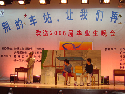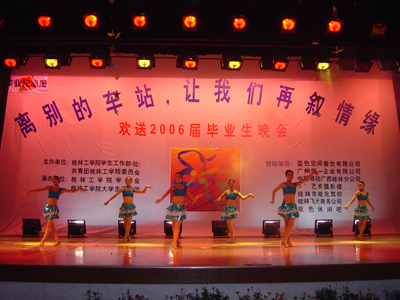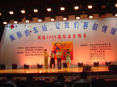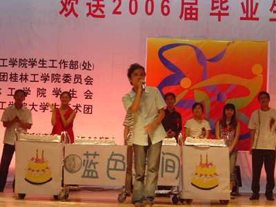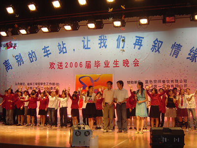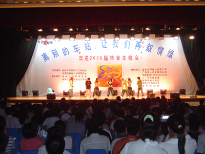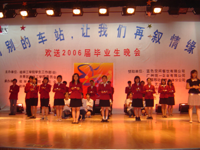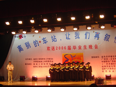 歌声远去,离别在即,虽然今天将近三个小时的晚会在漫长而难忘的大学四年面前显得那么的短暂,但是它又是那么的沉甸甸,携带着我们对2006届毕业生的无限祝福而永埋心间。心中的激情燃烧依旧,我们用一颗感恩的心将瞬间化做了永恒。让我们再次在心中默默祝福:亲爱的桂工毕业生们,愿你们在新的征途上扬帆起航,乘风破浪!