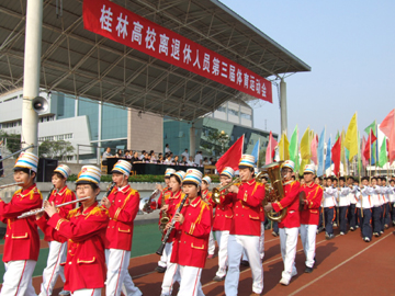 桂林高校离退休人员第三届体育运动会是由我院承办的一次传统老年人综合性体育盛会。 5月20日上午,桂林高校离退休老干部齐聚桂林工学院运动场,以简洁热烈的开幕式拉开了桂林高校离退休人员第三届运动会的序幕。区教育厅离退处卢祖生处长、覃长征副处长、桂林电子科技大学谭永红校长、桂林医学院党委副书记宿富国、桂林航专党委副书记旷永青、桂林师专副校长林铁城、广西师范大学离退总支书记甘卓勇,以及广西大学、广西民族大学、广西医科大学、广西师范学院、广西中医学院、广西艺术学院、广西教育学院的离退处负责人应邀参加了本次运动会开幕式。 入场式上,会旗、管乐方块、彩旗方块与来自6所桂林高校运动员代表队依次在雄壮的乐曲中进入运动场。我院离退处陈开亿处长主持了本次开幕式。 我院党委书记阳国亮代表学院作为承办方致欢迎辞,对出席本次运动会的领导与来宾表达了桂工诚挚的问候和欢迎,并指出:高校离退休人员是我们的宝贵财富,他们为党和人民的教育事业作出了突出贡献,离退休后应保持身心健康,坚持锻炼身体,快乐安度晚年。举办桂林高校离退休人员运动会,目的是激发、引导和带动广大离退休人员积极参加全民健身运动,陶冶情操,延年益寿,以达到老有所为、老有所乐的目的。并预祝各代表队在本届运动会上取得优异成绩!预祝桂林高校离退休人员第三届体育运动会取得圆满成功! 区教育厅卢祖生处长代表自治区教育厅致辞,对历届桂林高校离退休人员体育运动会活动的开展给予了极大的肯定,并对我院在承办本届运动会中为运动员、嘉宾提供的周到服务,为各项比赛创造良好条件以及所作大量工作给予了极大的肯定。 裁判员代表、运动员代表宣誓后,开幕式胜利结束。来自桂林广西师范大学、桂林工学院、电子科技大学、桂林医学院、航专、旅专、师专等6所高校的367名运动员即将在为期两天的运动会上参加包括门球、篮球、乒乓球等十个趣味体育项目的比赛,他们将在“友谊第一,比赛第二”的氛围中赛出风格、赛出水平、赛出成绩。桂林高校离退休人员运动会每两年举办一届,作为运动会的承办方,我院早作准备,周密部署,细致工作,不仅在本届运动会的运动项目选择上更注意结合老年人运动特点,同时全体工作人员也以“忠于职守、热情服务”的姿态保障着整个活动愉快、安全进行。
