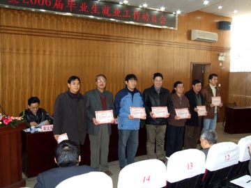 12月22日下午,我院2005届毕业生就业工作总结表彰暨2006届毕业生就业工作动员会在9501报告厅隆重召开。学院党委书记阳国亮、院长赵艳林、党委副书记张学洪、副院长李祥清,有学生的教学单位全体领导、教研室主任,全体政工干部,有关职能部门负责人和毕业生代表参加了会议。会议由招生就业处处长黄文龙主持。 大会首先由阳书记宣读我院2005届毕业生就业工作先进集体和先进个人表彰决定,资源与环境工程系、电子与计算机系、高职学院等三个单位荣获先进集体,柯天海等24人荣获先进个人荣誉称号。随后,受表彰的先进集体和先进个人上台领奖。 资源与环境工程系党总支副书记柯天海代表毕业生就业工作先进集体发言。他说,资环系在2005年的一次就业率高达92.6%,这主要是由于系党政领导十分重视就业工作,多次召开专题会议,分析毕业生的就业形势;积极与用人单位联系;平时注重学生的动手能力、吃苦精神、敬业精神和团队合作精神,提高了学生的就业竞争力。管理学院王若晨老师代表先进个人发言,他说,在出色完成自身的教学任务以外,努力与用人单位联系,帮助毕业生就业,充分发挥了专业教师的优势,为我院毕业生就业工作做出了自己的贡献。 张学洪副书记总结回顾了2005年我院的毕业生就业工作,深入分析了当前毕业生就业工作所面临的严峻形势,明确了2006年就业工作的目标任务和主要举措,全面部署了2006年毕业生就业工作。他指出,做好2006年毕业生就业工作,要努力做到以下几点:一、继续落实“一把手工程”,上下联动,齐抓共管;二、健全制度,规范管理、优化服务,进一步完善我院的毕业生完善我院的毕业生就业服务平台;三、提高就业指导水平,进一步落实教育部“制度化专业化、全程化、信息化”的要求。四、增强政治责任感和历史使命感,引导和鼓励毕业生面向基层就业;五、巩固和发展就业基地,拓展毕业生就业市场;六、突出职业技能培训,努力提高毕业生的就业竞争力;七、认真抓好考研和专升本等工作、提高就业质量;八、多方面收集信息,组织好各种形式的“双选会”;九、加强思想政治教育,重视贫困大学生的就业工作。 赵艳林院长与各系院签订了2006年毕业生就业工作目标管理责任状。 最后,阳书记发表了重要讲话。他指出,总结过去是为了展望未来,学院的毕业生就业工作事关全院工作大局,是检验各项工作的总标准。他说,张副书记很好地总结了2005年我院的毕业生就业工作,并对2006年的工作作了周密的安排和部署。他强调,做好毕业生就业工作,一是要不断分析形势,树立“三种意识” ;二是各级要加强领导,全面落实就业工作措施;三是要全员协同推进,完善工作体系;四是要确立创新理念,开拓崭新局面。他还建议,要让学生充分利用好暑期时间,增加实习机会,增强实践能力,提高动手能力,丰富工作经历,给就业增加筹码。