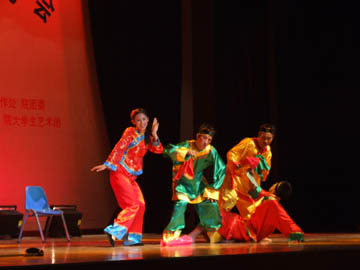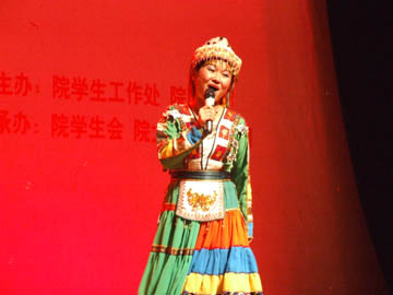 李君、蔡茂军老师深情演唱的《放马山歌》赢得了全场观众的掌声和欢呼声,他们高亢、激扬的嗓音久久回荡在体育馆内,晚会的现场气氛也达到了高潮。院团委万千老师以家户喻晓的祝英台形象,为观众上演了中国古典舞《书苑情话》,演绎了一段深苑里的“单相思”,赢得了观众的阵阵掌声。