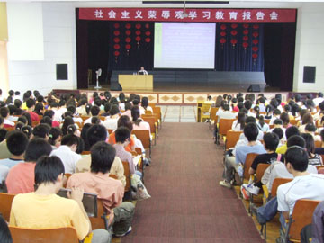 5月27日上午,在南校区礼堂,中国伦理学会德育研究会会长詹万生教授为我院近千名大学生作了一场精彩的形势政策教育报告,题为《民族精神及荣辱观的历史文化底蕴》。报告会由学院党委副书记张学洪主持。 詹万生教授结合我院实际,从大家熟知的“桂工精神”对于我院发展的重要性以及“桂工精神”与每一位桂工学子的密切关系入手,启发大学生们认识民族精神对于一个国家的重要性、民族精神与每一位公民包括每一位大学生的息息相关的关系;从荣辱观作为民族精神的重要组成部分,追溯中华民族精神及荣辱观的历史发展脉络,并结合当前社会的发展,启发大家要在继承中华民族精神及荣辱观的精华的基础上,认识树立社会主义荣辱观对于当代大学生实现人生价值的重要性。他强调,作为一名当代大学生,要精通古今,全面发展,要做一个真真正正的中国人,做一个堂堂正正的中国人,做一个学贯古今的中国人,做一个有中华文化底蕴的中国人!他还勉励大学生们要在人生道路上,以崇高的人格魅力,勤奋学习,不断进步。詹教授以其深厚的国学功底和渊博的学识,引经据典,讲古说今,吟诗诵文,并注重与大学生们进行交流互动,为大学生们上了一堂生动的荣辱观教育课,也上了一堂精彩的中国传统文化课,赢得了大学生们阵阵热烈的掌声。 詹万生教授身兼数职,除担任中国伦理学会德育研究会会长外,他还是中央教育科学研究所研究员,首都师范大学博士生导师,全国教育科学德育学科组专家全国教育科学“十五”规划重点课题“整体构建学校德育体系深化研究与推广实验”总课题组组长。他著述颇丰,主要著作有《人生哲学》、《待人处世的艺术》、《公共关系的艺术》、《中国传统人生哲学》、《德育新论》、《中国德育全书》等10余部,发表论文60多篇,并主持多项国家重点研究课题。