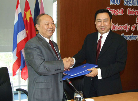 桂林工学院党委书记阳国亮(左)与泰国兰实大学签定合作联合办学协议
