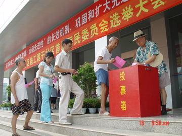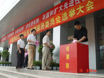 7月16日,首届桂工建干社区居民委员会通过民主投票选举后正式产生。 本次投票选举采取无记名方式,并实行公开投票、唱票、记票,公开开启票箱;3个投票点分别为学院体育馆、东城小区和民族基础教学部,另外,为方便因病不能到投票点投票的居民们行使自己的民主权利,还设立有流动投票箱。 上午8点多,社区居民们就顶着似火的骄阳来到了投票点,等待着投出自己庄严的一票。投票开始前,学院院长赵艳林在选举大会的主会场上发表了讲话。他希望广大社区居民们要充分利用宪法赋予自己的民主权利,选出最合适的首届桂工建干社区居民委员会成员;同时,也希望即将产生的社区居民委员会成员们要认真履行自己的职责,扎实工作,开拓进取,全心全意地为社区居民服务,切实维护好居民们的合法权益和社区的稳定,为构建文明和谐、安定有序的社会主义和谐社区,为学院的建设和发展而努力奋斗。随后,三个投票点按规定的时间进行了民主投票。 下午4点多,东江街道办事处副主任郭文金等同志来到了选举主会场,公开开启全部票箱。经过认真而紧张的记票、算票,首届桂工建干社区居民委员会正式产生,构成如下:何锦色任主任,苏中敏任副主任,委员为韦庆欢、奉远福、胡美春。