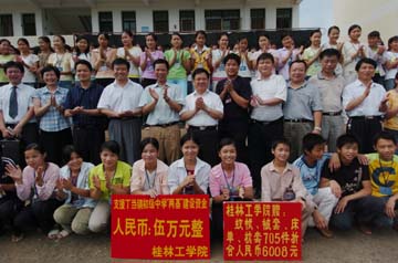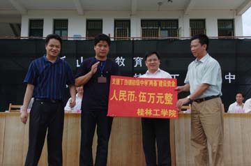 5月31日,我院一行人在学院党委书记黎志逘的带领下来到隆安县丁当镇初级中学考察并开展支教援助活动,受到隆安县委、县政府及老师同学们的热情欢迎。本次活动,我院支援隆安县丁当镇初级中学5万元资金和价值6千多元的物品,用实际行动支持该校“两基” 迎国检工作。 捐助仪式上,黎志逘书记勉励丁当镇中的全体同学,要树立刻苦学习、立志成才、报效祖国的远大理想,坚定艰苦奋斗、战胜困难、奋发图强的勇气和决心。刻苦学习科学文化知识,不辜负祖国和人民的期望,立志成为社会主义祖国的建设者和接班人。 在校园考察过程中,黎志逘书记在认真了解和检查该校的自备饮用水源和学生食堂餐厅的建设情况后,要求支教队队长崔建明同志切实抓紧抓好上述两项工作,特别是一定要妥善解决好饮用水质的达标问题。同时,他还要求我院资源与环境工程系党总支书记陈贵英回去后要组织技术力量支持帮助丁当镇初级中学解决好自备饮用水源的水质达标问题,彻底消除长期以来存在的师生生活饮水中的安全隐患。 在座谈会上,中共隆安县委书记容康社作了热情洋溢的讲话,他感谢我院多年来对隆安县的援助与帮扶。他说,有桂林工学院的支持与帮助,隆安县的“两基”工作一定能够顺利通过国家级的评估验收,希望丁当镇初级中学的全体师生要不断深化教育改革,树立教育新理念,全面推进素质教育和新课程改革,好好学习,努力工作,以优异的成绩报答桂林工学院的厚爱与希望;同时也希望学院及全体支教队员能够一如既往地关心和支持隆安县的教育事业,为振兴隆安县教育作出更大贡献。 黎志逘书记在认真听取了中共隆安县委常委、宣传部部长、副县长廖永新就隆安县“两基”迎国检工作情况汇报及自治区第十一期驻隆安县支教队队长崔建明同志的工作汇报后表示,正在发展的桂林工学院尽管也存在这样和那样的困难,但在得知丁当镇初级中学在“两基”迎国检中所面临的困难后,学院党委行政高度重视,在全力以赴帮助丁当镇初级中学做好“两基”迎国检各项工作的同时,还将立足自身在人才、科研方面的优势,在师资培训、科技服务、新农村建设规划、资源勘查等方面与隆安县进行合作,使学院更好地服务广西地方经济建设。他希望丁当镇初级中学全体师生以及支教队全体成员要齐心协力,再接再厉,奋力冲刺,以崭新的精神面貌和高质量的工作成效迎接国家评估验收,夺取“两基”攻坚战的全面胜利! 自2002年起,我院先后在隆安县南圩中学和丁当中学开展支教工作。为促进地方教育事业发展做了许多艰苦细致并富于成效的工作,使受援单位在规范教学管理、提高教师业务能力和水平、不让贫困学生辍学、改善办学条件等方面取得了显著成绩。学院因此连年被自治区授予支教工作先进单位、“有突出贡献”后援单位、“帮助攻坚资助贫困特别贡献奖”等荣誉称号。 我院参加本次考察慰问活动的成员有,学院党委副书记、纪委书记赵君,党委委员、人事处处长华桂林,宣传部、统战部部长于海平,院办副主任姜子亮,资源与环境工程系党总支书记陈贵英,南宁分院院长顾炳根,院办白凌婷同志等。