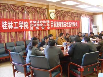 最后,李祥清副院长代表学院分别与34个系部处签订了《桂林工学院2006年消防安全目标管理责任书》和《桂林工学院2006年社会治安综合治理和安全稳定工作目标管理责任书》。