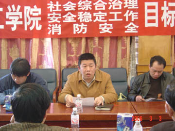 签字仪式开始前,院保卫处李治处长通报了二OO五年我院校园安全强化工作的情况,学院副院长李祥清对学院在新的一年里的综合治理、消防安全工作做了指导性讲话,李院长肯定了学院二OO五年安全工作所取得的良好成绩,同时,指出消防综合治理、消防安全是事关全院整体工作的一项重要工作,希望各部门要结合自身的特点,针对各自消防安全、治理中存在的隐患点,采取切实有效的措施,严防各类不安定事件的发生,确保学院在安全、文明、和谐的校园环境中稳步推进“两申”目标的实现。
