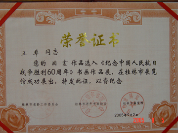 为纪念抗日战争胜利60周年,弘扬爱国主义精神,丰富离退休同志业余文化生活。近日,我院离退休书画协会组织离退休书画爱好者参加了由桂林市老龄工作委员会、桂林市老年书画协会、桂林市展览馆联合举办的《纪念中国人民抗日战争胜利60周年》书画作品展,我院雷林源、张文娜、胡承绮、何于一、王华五位老师的参展作品获荣誉证书。