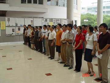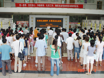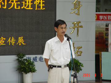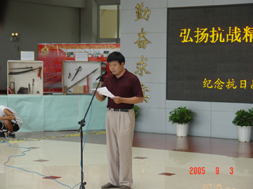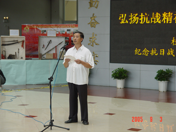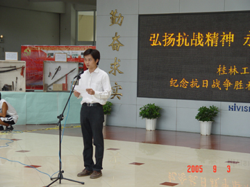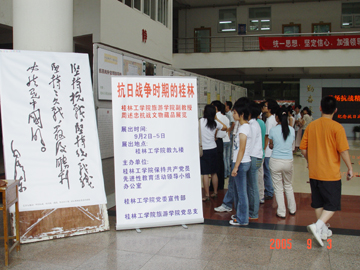 9月3日上午,我院纪念抗日战争胜利六十周年宣传展在教九楼一楼大厅隆重开幕。此次宣传展结合保持共产党员先进性教育活动而举办,主题为“弘扬抗战精神、永葆党的先进性”,展出的主要内容是我院旅游学院副教授周述忠同志收藏整理的桂林抗战时期的图片、实物、报刊等历史史料。 开幕式由学院党委宣传部部长于海平主持,周述忠副教授、学生会主席张瑞同学分别作了发言,学院党委组织部部长赵君、学院党委书记阳国亮先后发表了讲话。 阳书记在讲话中代表学院党委和行政首先对我院纪念抗战胜利六十周年宣传展顺利开幕表示衷心的祝贺,并对周述忠副教授为学院开展爱国主义教育和保持共产党员先进性教育所做出的贡献表示衷心的感谢。他说,周述忠副教授以实际行动体现了桂工精神和共产党员的先进性,全院师生员工都要向周述忠老师学习。阳书记强调,在观看展览的时候要注意看到中国共产党在中国人民赢得抗日战争胜利的过程中所处的重要历史地位,同时要深刻领会中国共产党在抗日战争中所表现出来的先进性。抗日战争的历史证明:中国共产党及其领导的人民武装力量,是全民族利益最坚定的维护者,是团结抗战的中流砥柱,是取得抗战胜利的决定性力量。中国共产党由于始终高举争取民族解放的大旗,在最困难的条件下坚持敌后抗战,坚持团结全国最大多数人的抗日民族统一战线政策,从而得到了人民的信任。中国人民在抗战中,进一步认识到了只有中国共产党才是代表广大人民群众根本利益的先进政党。 开幕式结束后,大家观看了展览,并进行了观展签名留念。