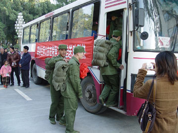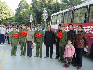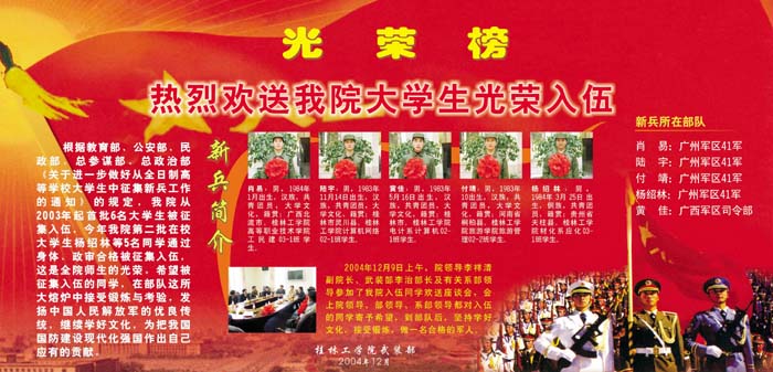 12月10日,我院5名大学生告别母校,踏上了从军之路。这五名学生分别是来自高职学院的陆宇和肖易、材化系的杨绍林、旅游学院的付靖和电计系的黄佳,李祥清副院长和武装部部长李治亲自为他们送行,并与他们合影留念。
