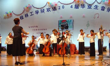 6月24晚8点未到,体育馆三楼的礼堂内已座无虚席,人群拥挤。慕名而至急欲一睹我院著名乐队——星空乐队的师生们已有些迫不及待了,盼着“2004年欢送毕业生文艺晚会”暨星空乐队专场音乐会的开场。 “我们的家乡,在希望的田野上……”《在希望的田野上》拉开了晚会的序幕。接下来,《远方》,《 It’s my life 》星空乐队带来的一首首精彩绝伦的摇滚音乐一次次把大家的激情活跃起来,礼堂里不断爆发起一阵强过一阵的浪潮般的掌声。晚会在星空乐队歌手们的精彩演艺中出现了一次次的高潮。 “当生活到达完美时刻,当花开烂漫时……”嗯?怎么这歌声那么优美?这乐声那么轻柔?这种风格不像是星空乐对啊?原来是一首来之桂电Silense乐队的《完美时刻》。今晚的晚会除了有星空乐队,管弦乐团和我院的另一支新秀乐队——霓虹灯乐队外,同时也邀请了桂电Silense 乐队,师大的丝线普乐队,地教院逆流乐队一起同台演出。来自各兄弟院校的朋友们同样博得了阵阵喝彩的掌声。 《让我走吧》对待新生活我们《勇往直前》,《绽放》自己直到过上《完美生活》,歌声表达了年轻人生活的乐观和勇敢,也深深的表达了对毕业生们的祝愿和祝福。 在一阵纯音乐演奏《友谊地久天长》中晚会落下帷幕,我们今晚《不愿睡去》,让我们同唱一首《缘分之恋》,为大学缘分欢呼,为毕业生们祝福。