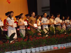 在李祥清副院长首先宣读了《关于表彰2004年度全区普通高等学校优秀大学毕业生的决定》和《关于表彰2004年度学院优秀大学毕业生的决定》之后,获奖同学纷纷走上主席台,从学院领导手中接过沉甸甸的获奖证书。他们当中有2004年广西区的选调生;有服务西部计划的志愿者;有自治区和学院的优秀毕业生代表。