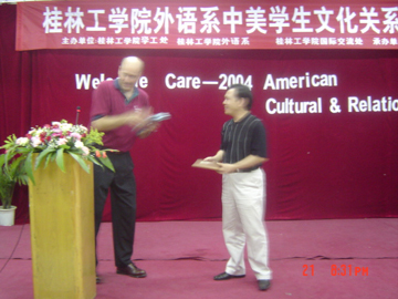 6月21日晚8时,从体育馆附四楼传来阵阵欢声笑语,笑脸在此刻定格,友谊在此刻成为永恒……桂林工学院外语系学生文化关系交流周在此隆重开幕。出席本次开幕仪式的领导有院党委副书记唐善茂老师,院学工部部长梁军老师,院国际交流处处长朱晓媚老师,院团委书记江云青老师,外语系党总支书记张雄老师,外语系党总支副书记范玲老师等。美国访问团一行25人也应邀出席了本次开幕仪式。 首先,院党委副书记唐善茂教授向美国团致了热情洋溢的欢迎词, 对美国访问团的来访表示诚挚地欢迎,并指出此次交流活动的开展具有积极深远的意义,并希望通过这次来访能够加强中美高校的交流和合作,以促进两国的文化交流及学术发展。随后,美国访问团团长Dave也对本次访问活动表示热烈地祝贺,对我院师生的盛情款待表示衷心地感谢,并代表美国访问团向外语系赠送了书籍等礼品,表达了他们对本院师生的深厚情谊。此后,中外双方的精彩表演使本次活动高潮迭起。最后,美国访问团与我院师生合影留念。