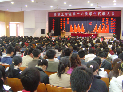 2006年4月15日早上8点半,伴随着庄严而隆重的《中华人民共和国国歌》,桂林工学院第十六次学生代表大会在南校区礼堂隆重召开了。328名代表以及桂林各大高校(广西师范大学、桂林电子科技大学、桂林医学院、桂林航天工业专科学校、桂林陆军学院、桂林师范高等专科学校)的学生会代表参加了本次大会。