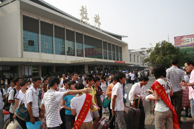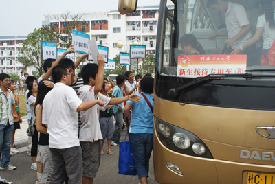 迎新志愿者在火车站热切期盼新生到来