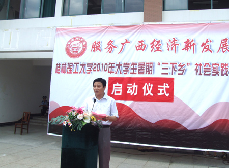 7月6日上午,我校2010年大学生暑期“三下乡”社会实践启动仪式在桂林理工大学雁山校区三栋教学楼前广场举行。学校党委副书记王赣华,党委宣传部、统战部副部长叶昊,学工部(处)部(处)长副部(处)长张雷,校团委副书记白凌婷以及学校各学院团委书记出席了本次活动。启动仪式由校团委副书记周国桥主持。 启动仪式上,校团委副书记白凌婷对学校2010年社会实践活动进行了总体安排。提出本次实践活动要围绕“服务广西经济新发展”主题开展,要求各个学院团委把“三下乡”社会实践活动作为实施大学生素质拓展计划的重要内容,引导学生广泛参与暑期社会实践活动,进一步扩大覆盖面,推动大学生社会实践工作的科学发展。社会实践团代表应用技术学院市场营销09-2班徐衍智同学、学校重点团队指导教师代表化学与生物工程学院汪晟老师先后作了发言。 学校党委副书记王赣华在启动仪式上发表了讲话。他代表学校党委、行政向积极参与社会实践活动的老师和同学们致以亲切的问候和良好的祝愿,希望同学们要在社会实践中树立我校学子的良好形象,努力把在学校中所学到的知识运用到社会实践中去,把立志成才、全面发展的强烈愿望转化为服务群众、奉献社会的实际行动中,为服务广西经济新发展贡献自己的力量。王赣华副书记对参与本次实践的志愿者提出了三点要求:一要扎实开展工作,确保实践活动取得实效;二要虚心向人民群众学习;三要精心组织,确保安全。最后,王副书记预祝2010年暑期大学生社会实践活动取得圆满成功。 在校学生会常务副主席覃皓同学的带领下,参加启动仪式的实践团队成员庄严宣誓。随后,举行了授旗仪式。 伴随着《歌唱祖国》的嘹亮歌声,我校2010年大学生暑期“三下乡”社会实践活动正式启动,20多支实践团队将围绕“服务广西经济新发展”的主题,奔赴各地开展丰富多彩的实践活动。