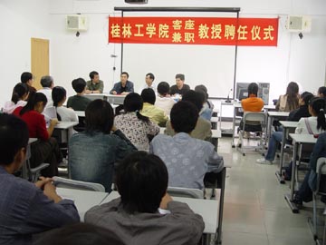 国际动画学会会员、中国动画学会常务理事、上海同济大学动画系主任王刚教授于2004年11月4日— 6日对我院进行为期三天的访问和讲学,11月5日上午在教九楼9501室作了三小时题为:《动画思维及机制建构》的精彩讲座,讲座获得圆满成功。下午王教授又与艺术设计系部分教师和动画专业的学生一起座谈,提出不少合理化的建议,将对我院艺术设计系动画专业学科的建设和发展起到积极的促进作用。同时王刚教授还被聘为我院兼职教授,桂林工学院院长、博士生导师赵艳林教授亲自为王刚教授颁发了聘书,在授聘仪式上王教授和赵院长都分别作了热情洋溢的讲话。