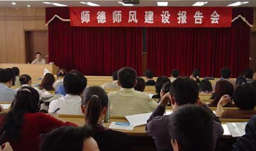 10月29日下午,我院教务处在9501教室举办了一场师德师风建设报告会,由我院原党委书记刘积夫教授和广西师大教育学院副院长唐德海教授主讲,全院教学一线教师参加了此次报告会。 刘积夫教授认为,大学是学生走向社会的最后驿站,大学教师肩负着当好最后一班领路人的重担,因此,作为大学教师,应自觉把加强师德师风修养放在更加突出的位置,真正履行好教书育人的责任。而要当好领路人,就必须做到以高尚的人格感染人;以丰富的学识引导人;以创新的精神激励人;以博大的胸怀爱护人。他还希望教师们要多了解学生对老师的期待,以便更好地指导教学工作。唐德海教授作了题为《大学教学的过程与方法》的报告。 目前,我院处于迎评冲刺阶段,各项迎评工作正如火如荼地进行,举行师德师风建设报告会,是我院加强师德师风建设、以优良的师德师风迎接评估的重要举措之一,两位教授的精彩报告将会有力地促进我院师德师风建设再步新的台阶,我院广大教师将以更好的师德师风为评估取得好成绩加上重重的一块筹码。