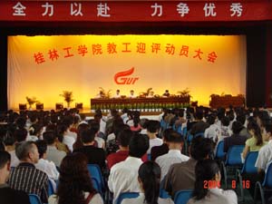 全院教职工迎评动员大会8月16日上午在体育馆三楼召开,院党委书记、院长陈大克在会上作了动员报告,他号召全体教职工发扬桂工精神,奋战80天,为实现优秀的评估目标做出自己的贡献。