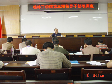 按照学院党委的安排,学院第三期领导干部培训班于6月16日上午开班。 本期培训班的学员来自学院机关、行政职能部门和党群纪委、团委等单位,共有31名处级、副处级干部。与前两期一样,培训班仍采取专题讲座、外出参观考察、讨论交流、撰写心得体会等培训形式。针对学员多数都在学院管理部门这一特点,本期培训班安排了四个专题讲座,题目分别为《领导干部要做“保持党的先进性”的楷模》、《提高党的执政能力要从本职工作做起》、《正确认识行政效能监察的意义,不断改进机关工作作风》、《以人为本,依法治校》,由学院党委书记阳国亮、院长赵艳林、党委副书记唐善茂、党委副书记张学洪先后主讲,参观考察的地点设置在广西师范大学。