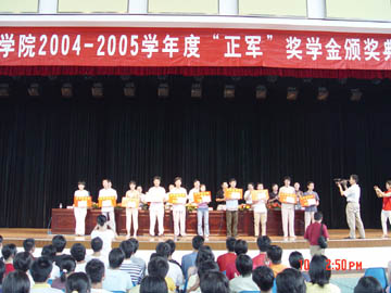 今天是我院贫困生的好日子,校友孙正军捐资30万在我院设立“正军”奖学金,对品学兼优的贫困生给予物质支持、精神鼓励。6月10日下午,2004-2005学年度“正军”奖学金颁奖典礼在我院体育馆三楼举行。院领导、相关部门负责人、学工系统干部、院系班三级学生干部以及获奖学生近2000人参加了本次典礼。我院贫困生中40位一等奖学金获得者每人将得到3000元奖励,90位二等奖学金获得者每人将得到2000元奖励。