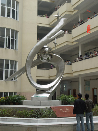 为感谢母校培育之恩,物探79级全体校友在毕业二十周年聚会之际,委托原物探系学生支部书记、辅导员柯天海老师筹建一座校园雕塑献给母校。在学院领导、院综合管理处的积极支持下,经柯天海老师精心策划,一座取名为“探索”的不锈钢雕塑已于开学时正式在教9楼一楼天井内落成。