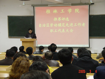 3月4日下午,学院召开推荐评选2005年自治区劳动模范先进工作者职工代表大会,100多名教职工代表出席会议。会议由院工会副主席蒙崇超主持,院党委副书记、院工会主席唐善茂在会上就推荐评选条件及相关问题作了说明。为了做好这次推荐评选工作,学院还成立了以唐善茂为组长,赵君、蒙崇超为副组长的推荐评选小组。