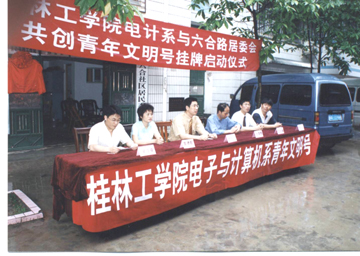 5月15日上午,桂林工学院电子与计算机系分团委与七星区六合社区居委会冒雨举行了隆重的共创社区青年文明号挂牌启动仪式。 院团委书记江云清老师、电计系党总支书记徐和飞老师、副书记李军朝老师、分团委书记辛立章老师、六合区居委会任荣辉书记和曾德懿主任以及全体青年志愿者和社区居民代表参加了本次活动。 一直以来,电计系分团委努力为广大同学寻找活动的载体,提供锻炼的舞台,向社会展示了我院大学生良好的精神风貌,使一批大学生在实践中接受了锻炼,增长了才干。此次与七星区六合社区居委会举行共创社区青年文明号活动,就是为了使我系学生深入社区、了解区情、接受锻炼、经受考验、完善自我、传播文明、奉献爱心,以社区为载体开展志愿服务,为社区居民提供服务。 在启动仪式上,院团委书记江云清老师、电计系党总支书记徐和飞老师先后讲话,他们对这项工作给予了充分肯定,为工作的开展提出了具体的要求,指明了方向,同时对广大青年志愿者提出了殷切的希望。青年志愿者代表邸蔚发了言,表示广大青年志愿者一定按照领导的讲话要求,积极参加各项志愿活动,不怕苦、不怕累,积极奉献,为社区的精神文明建设贡献力量。 最后,辛立章老师和六合社区居委会曾德懿主任签订了共创社区青年文明号协议书,江云清老师、徐和飞老师、六合区居委会任荣辉书记和曾德懿主任共同为共创青年文明号活动揭牌。