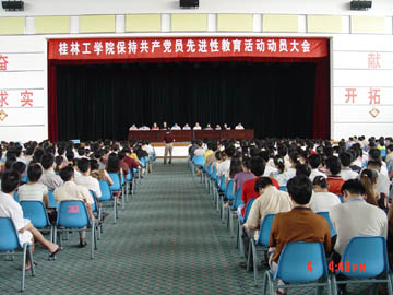 根据自治区党委和高校工委的部署,学院作为第二批保持共产党员先进性教育活动单位,从7月份开始在全体党员中开展以“三个代表”重要思想为主要内容的保持共产党员先进性教育活动。7月4日下午4:30分,学院在体育馆三楼报告厅隆重召开保持共产党员先进性教育活动动员大会,就学院开展保持共产党员先进性教育活动进行动员和部署。学院领导、自治区高校工委保持共产党员先进性教育活动督导组桂林片组长李善辉等7位同志,全体在职教职工党员、离退休党员、学生党员以及入党积极分子、民主党派代表、群众代表共计1300多人参加了大会。大会由院党委副书记、院长赵艳林同志主持。