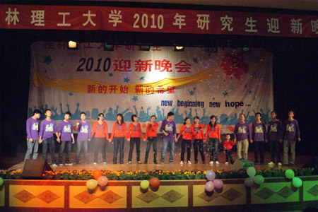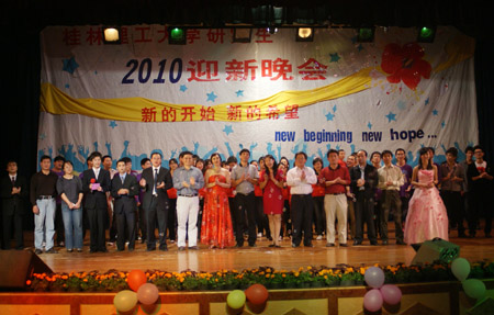 10月22日晚,2010年研究生迎新晚会在屏风校区礼堂隆重举行,学校吴志强副校长,学工处、研究生处、校团委及各学院主管研究生教育领导与2010级研究生一起观看了晚会。 吴志强副校长代表学校欢迎广大莘莘学子到桂理工这个大家庭读书深造,并简要介绍了学校学位与研究生教育情况,希望大家在读研期间学习、生活都取得进步。 晚会在《溜溜的康定》的欢快舞蹈中开始,来自各学院的研究生通过独唱、小合唱、舞台剧等丰富多彩的节目形式展示了他们的精神风采,精彩的节目不时赢得了观众的阵阵掌声。今年也是我校MBA学位点首年招生。为参加迎新晚会,MBA学员们积极排练。来自台湾的MBA学员陆华瑄等还与大陆学员一起朗诵配乐诗《台湾,我多想触摸你》。深情的语句、真挚的感情道出两岸同胞“我们本是血肉相连”的心声,打动了现场的每一位观众,纷纷为他们的精彩演出报以热烈掌声。 晚会在合唱《相亲相爱的一家人》的动人旋律中结束。